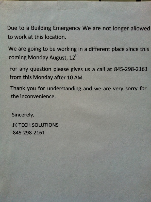 Wow, look at that professional (for a local place) banner. I mean, it even says, "The Hudson Valley's #1 Computer Repair Provider"! Service has to be really great here, right? Well, as you could see from my last post, I just wanted to get the hell out of there so they could fix my laptop. Problem was identified just fine, it's 20 minutes away... What could go wrong?